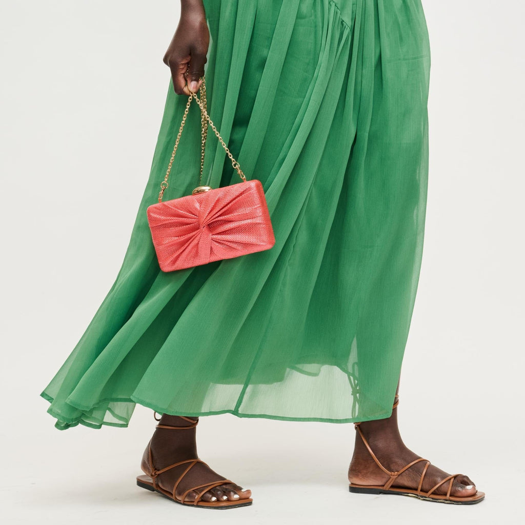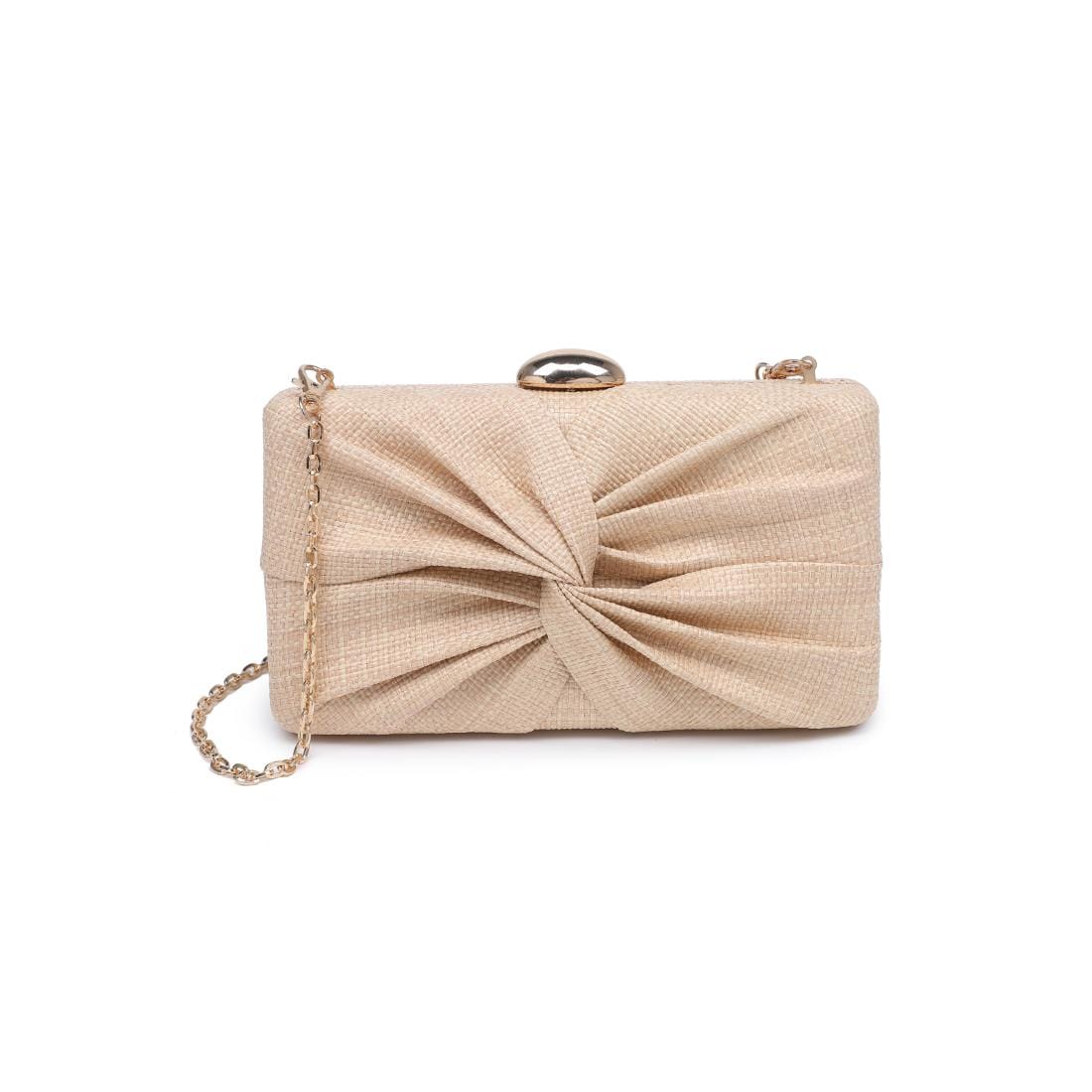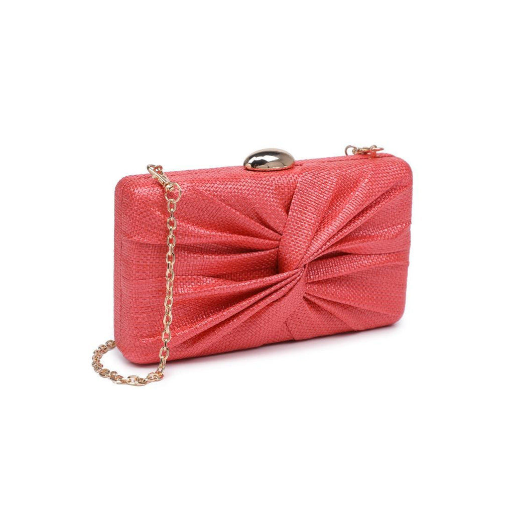 Serenity Evening Bag, knotted-pleat hard-case clutch. Structured silhouette, luxe woven texture, and a sculptural knot-front detail that complements formal looks. Removable chain strap converts from shoulder to handheld. Secure snap-top closure, compact interior fits phone, cards, lipstick. Vegan-friendly materials and polished hardware make it an ethical, modern choice for weddings, cocktail nights, and date evenings.