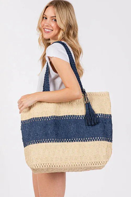 Carry all your essentials in style with the MB0273 Two Tone Woven Straw Tote Bag. Made from durable straw material, this bag is perfect for a day at the beach or a trip to the farmer's market. Its two-tone design adds a touch of whimsy to any outfit. (Fits all your must-haves!)