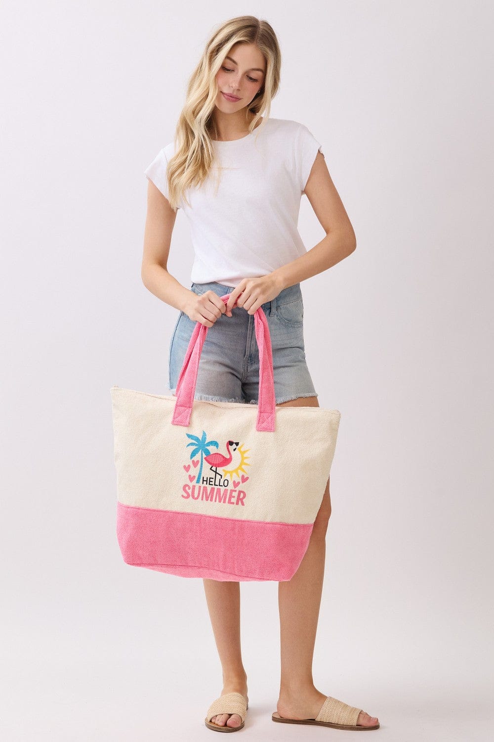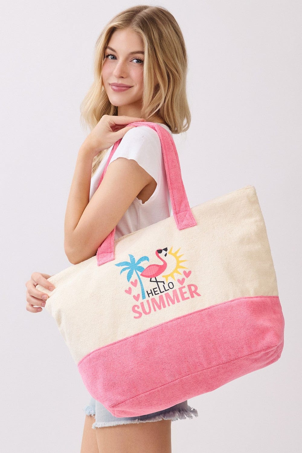 Dive into summer style with this cheerful terry beach tote! Perfect for sandy days and poolside adventures, this spacious bag keeps all your essentials organized while you soak up the sun. The soft, absorbent terry fabric adds a cozy touch, and the roomy interior easily fits towels, sunscreen, and beach reads. Whether you're heading to the shore or the local pool, this vibrant tote brings instant vacation vibes wherever you go. Your new summer sidekick awaits!